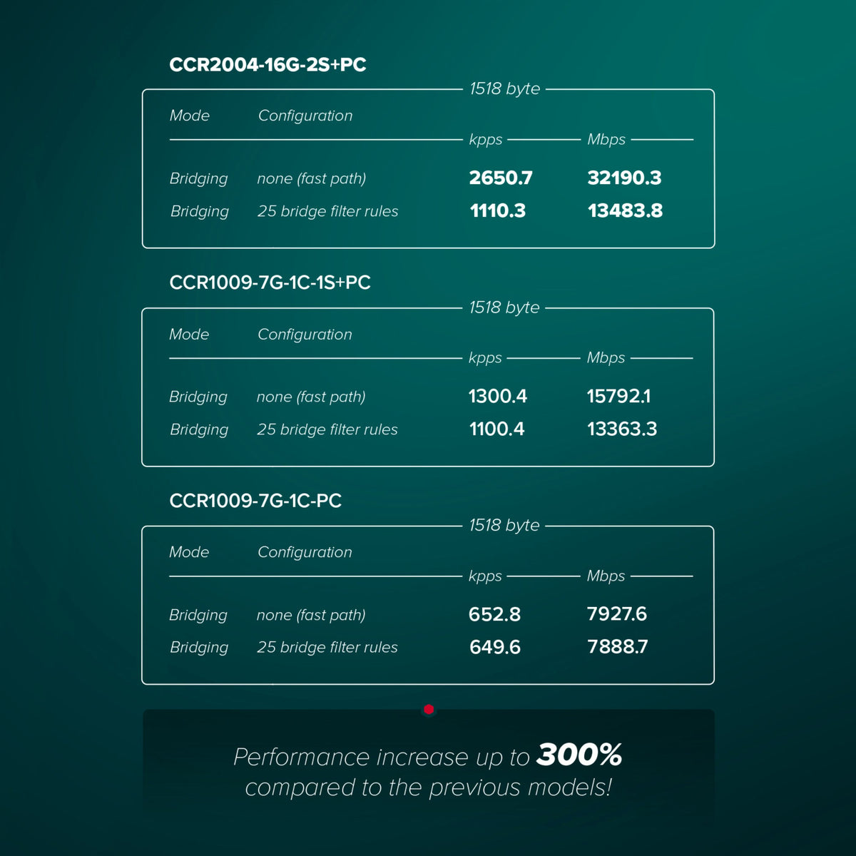 So as you can see - no bottlenecks. As long as the CPU can handle the processing, all ports can reach wire speed. And this CPU is a beast that can handle a lot. If we look at the performance, you can see that it is trading blows with our CCR1009.