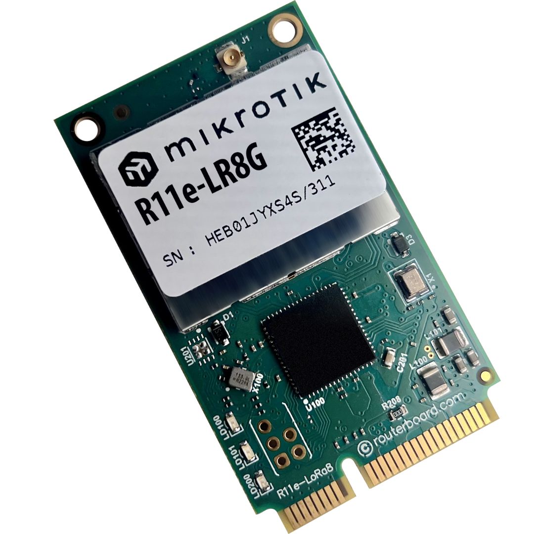 The MikroTik R11e-LR8G Card enables LoRa® connectivity via miniPCIe in various MikroTik setups. Exceptional Rx sensitivity (up to -141 dBm for 868MHz) ensures reliable long-range communication, built-in GPS.
