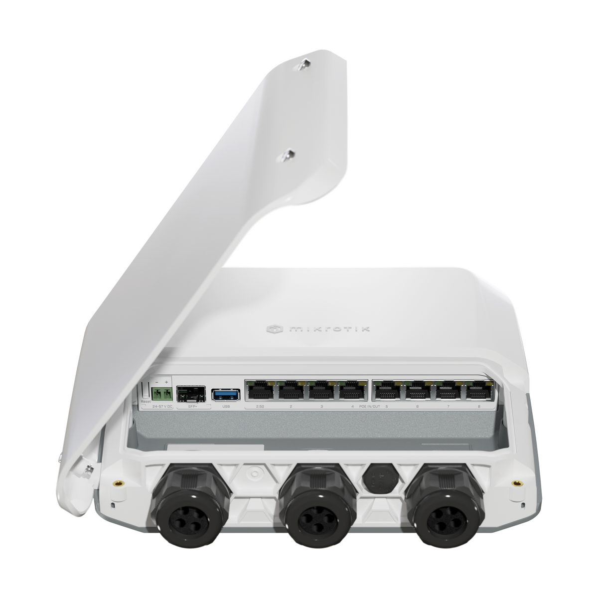 An outdoor version of our best-selling heavy-duty PoE router. Extensive power redundancy for the best price! 7x Gigabit Ethernet ports, 1x 2.5 Gigabit Ethernet, 10G SFP+, 1GB of RAM, 1GB NAND, modern quad-core CPU, 9 (!) powering options, durable IP67 waterproof enclosure.