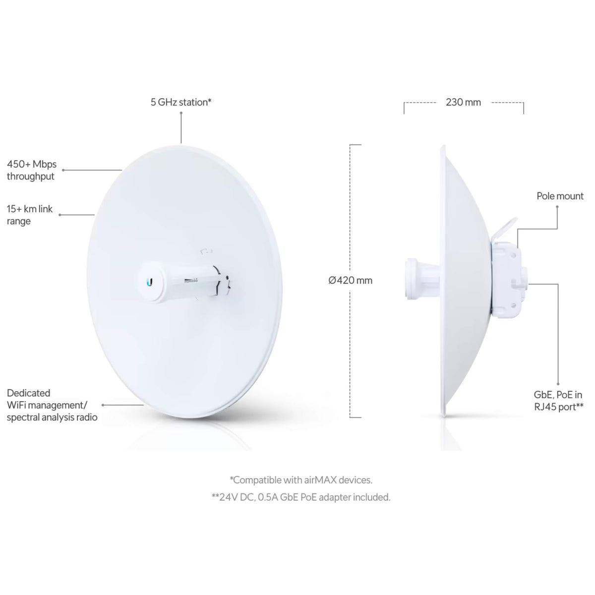 The is a Ubiquiti airMAX PowerBeam 5AC Gen2 US [PBE-5AC-Gen2-5-US] is a 5-pack of a high-performance 5 GHz Point-to-Point (PtP) bridge with integrated dish reflector. Provides up to 450+ Mbps data throughput.